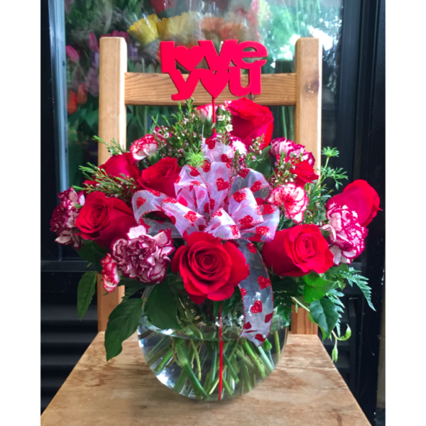 Red roses, red carnations, waxflower and a mix of green fillers in a glass fish bowl with a Valentine’s pin and bow.