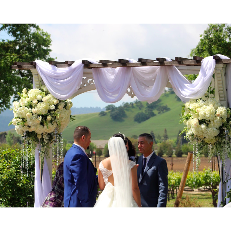 In the picture a pergola with chandeliers and chiffon draping fabric.