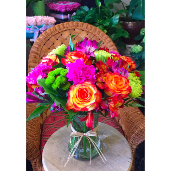 Bright combination orange, purple and green: roses, carnations, spider mum and alstroemerias in a glass vase with a raffia.