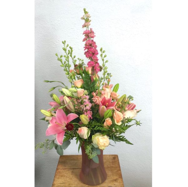 Blooms in pink, a blushing combination of roses, larkspur, stock and lilies.