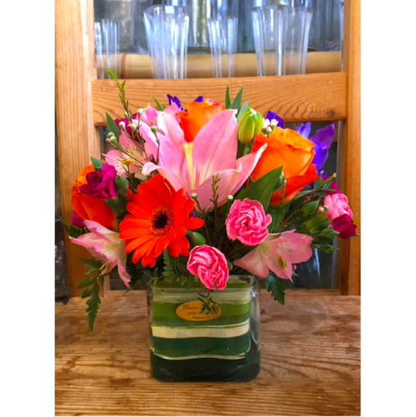 Orange and pink gerberas with lilies, roses, carnations, alstroemerias and other fillers in a glass cube.