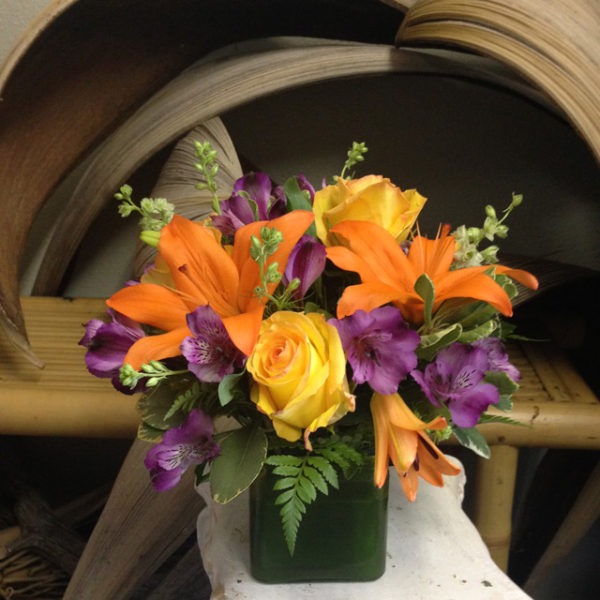 Mix of roses, lilies, alstroemerias and fillers in a small glass cube
