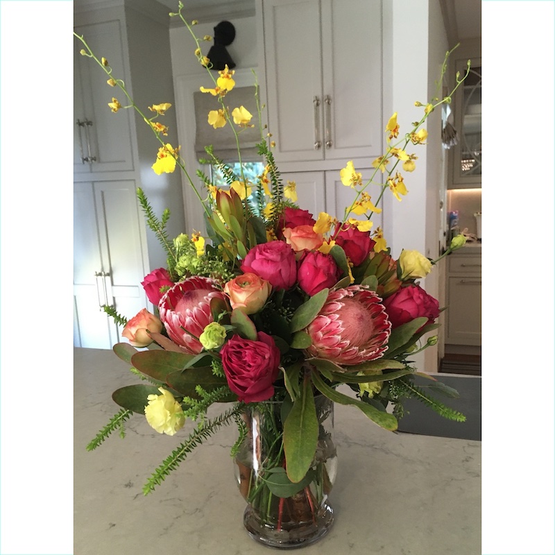Roses, proteas and orchids are mixed in a very elegant glass vase. This is an elegant design for a special person that appreciates the beauty of nature and flowers.