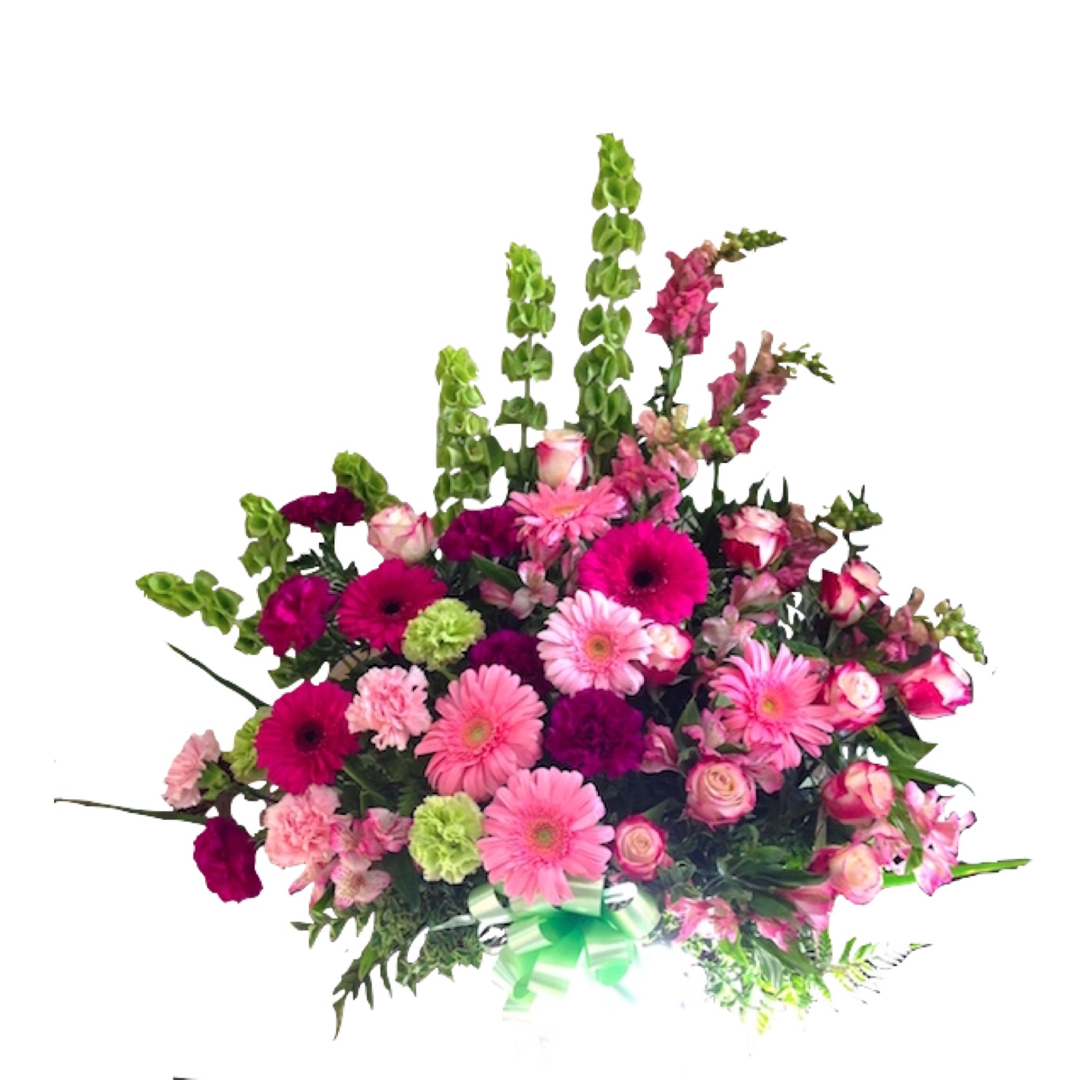 Pink combination of gerbers, roses, carnations, snapdragons, alstroemerias, bells of Ireland and fillers in a floor Vase.