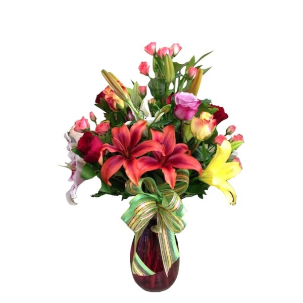 Mixed lilies, roses, baby roses and fillers in a red glass vase with a colorful bow.