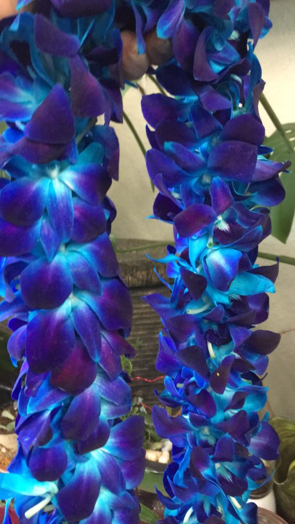 Blue Lei is made of fresh orchids, delicately threaded one by one to make a beautiful string. This special design is used as a gift for graduations, it means that you wish the graduate good luck in the next chapter of their life.