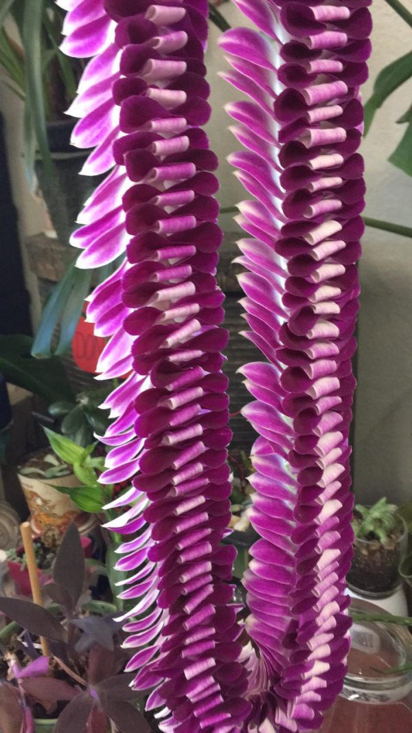 This Double Purple Lei is made of purple Dendrobium fresh orchids that are delicately folded one by one to make a beautiful thread.