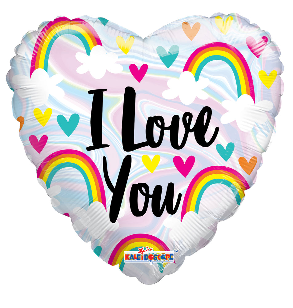 I Love You mylar balloon with colorful rainbows and assorted ribbons.