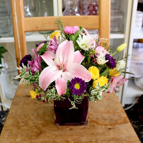 Mix of asiatic lilies, baby roses, alstroemerias, matsumotos and daisies with a variety of green fillers in a purple glass cube.