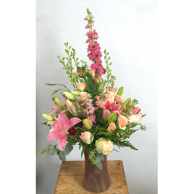 Sweet and elegant combination of pink roses, lilies, larkspur and other seasonal fillers in a pink vase.