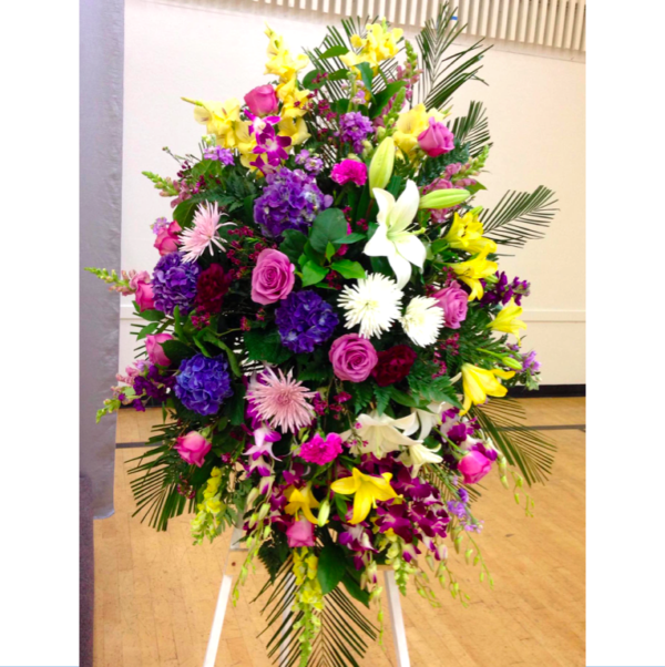 This standing spray has roses, asiatic lilies, spider mums, snapdragons, gladiolus, hydrangeas and orchids.