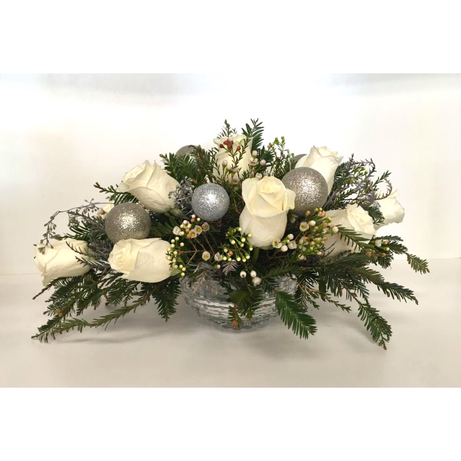 Elegant Christmas centerpiece in silver colors for the Holidays. Send this elegant silver arrangement to your loved ones for Christmas.