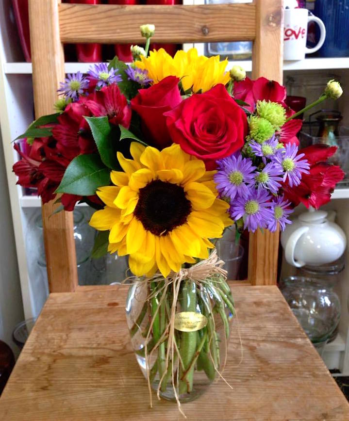Sunflower mix with red roses and mums in a glass vase. Flower delivery in Richmond CA. Local Florist. Flowers and gifts.