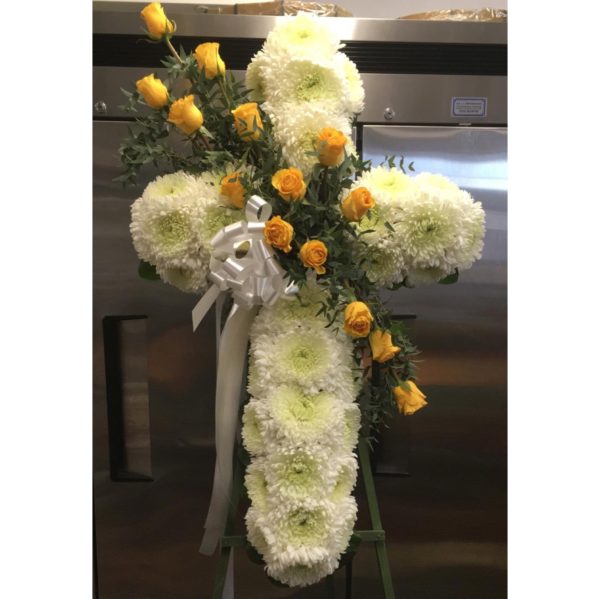 Sunrise standing Cross. Funeral Flowers. Sympathy Flowers. Fresh Flower delivery. Flower Cross for Funeral. Yellow Roses.