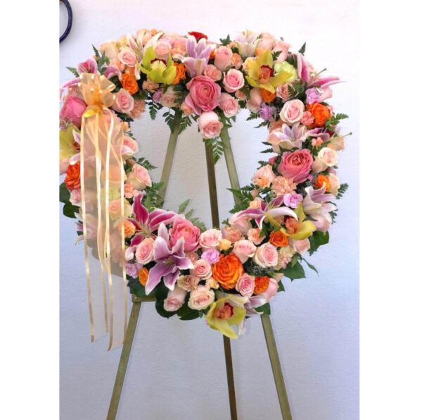 Sunset in Paradise Heart. Funeral Flowers. Sympathy Flowers. Fresh Flower delivery. Heart Standing Spray. Roses. Flowers Funeral