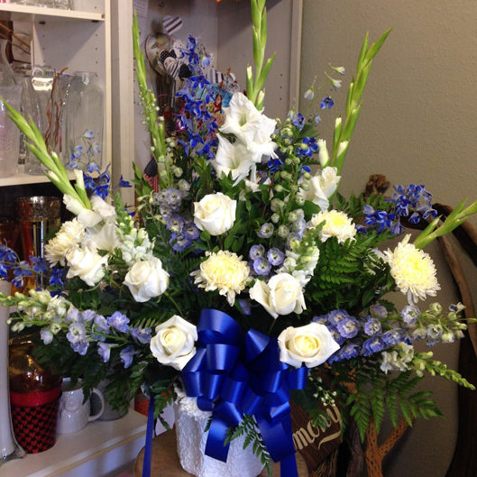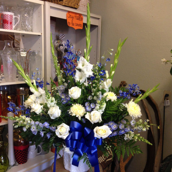 White Gladiolus, Roses and Mums mixed with Delphinium and fillers ina floor vase and a blue bow