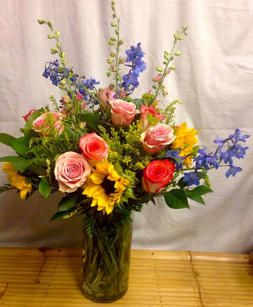 A combination of Roses, sunflowers, larkspur and solidago in a transparent glass vase.