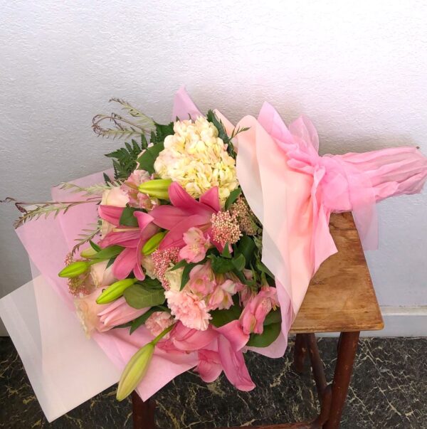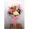 This sweet bouquet has a combination of pink blooms wrapped in paper.